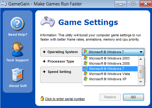 GameGain menjawab tiga pertanyaan sebelum yang menentukan apa tweaks diperlukan untuk komputer Anda untuk menjalankan games supaya lebih baik. Pertama, pilih sistem operasi Anda.